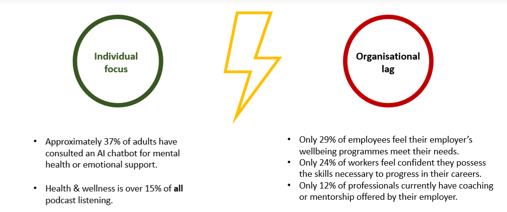 Individuals are reacting faster than organisations. They are seeking out help and support from podcasts, from books, and increasingly from AI agents. While organisations are tending not to prioritise resolving these challenges in a meaningful manner.